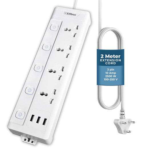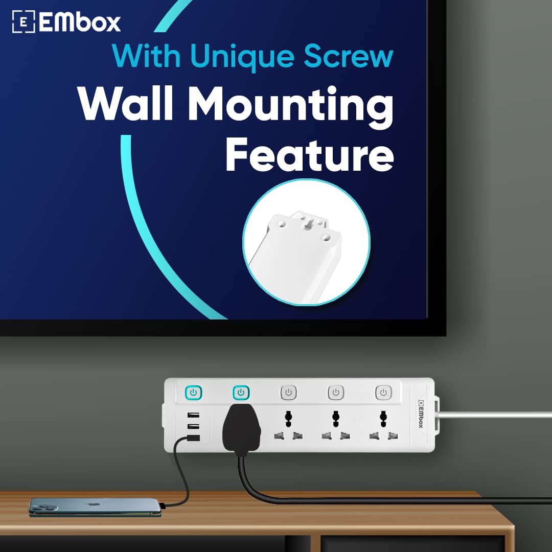 EMBOX 10A Extension Board with USB Port- 4 Universal Sockets and 3 USB (2.4 A) Charging Ports with Indicator, 2500W Heavy Duty Cable, 250 Volts (2 Meter Cable)