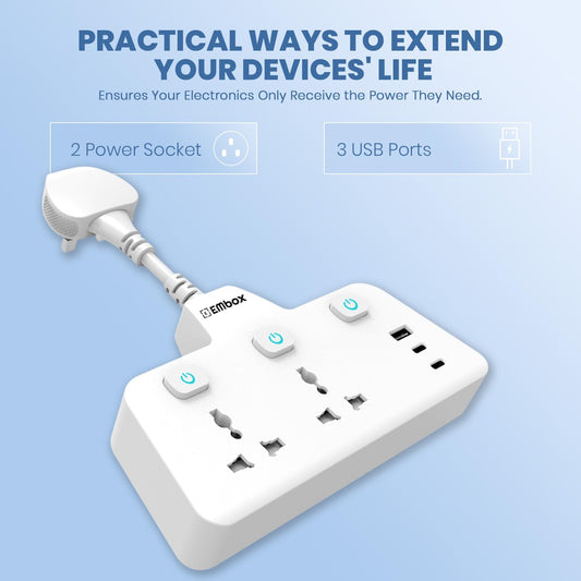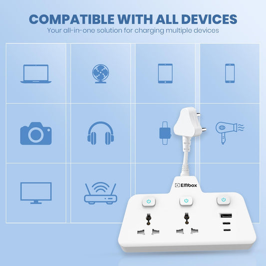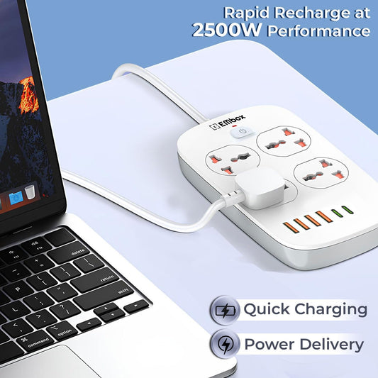EMBOX Multi Plug Socket 2500W | Extension Board with Switches | QC 3.0 Type C USB Fast Charging | 2 Universal Socket Extension Cord, White