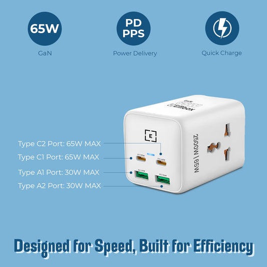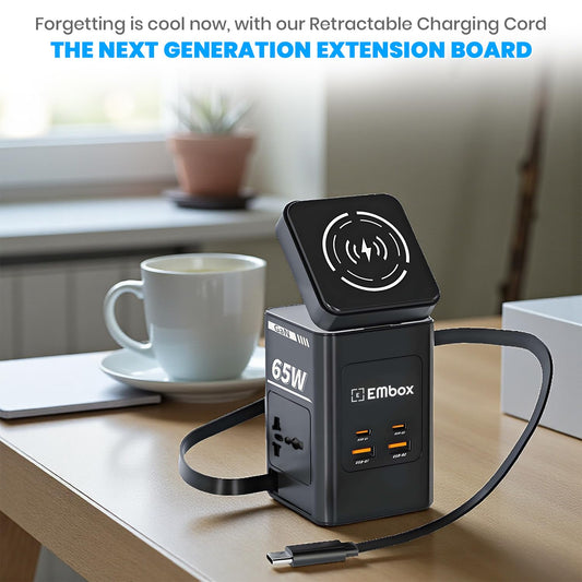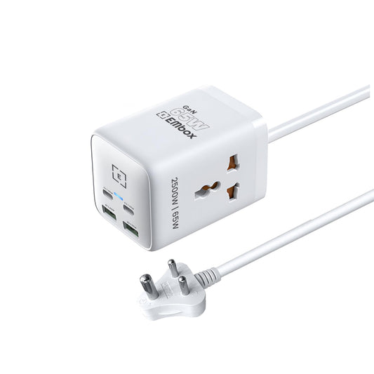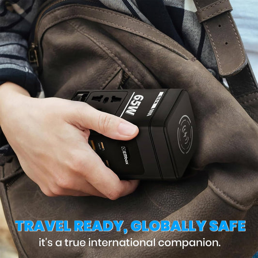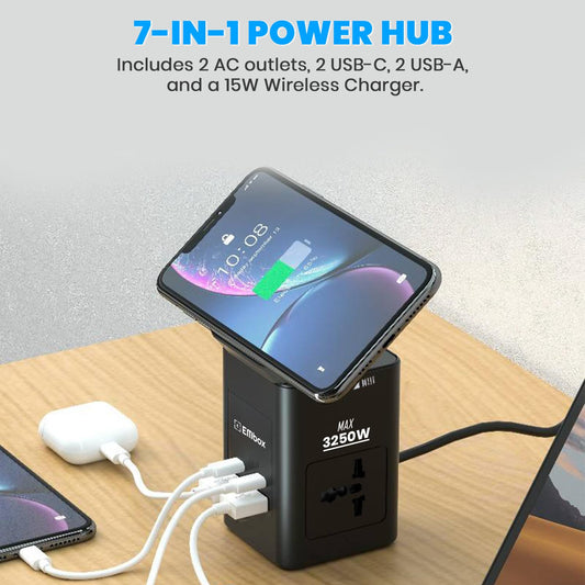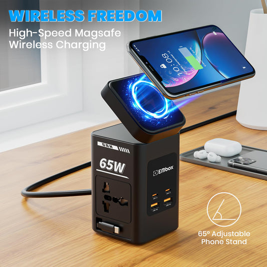 Embox 7-in-1 Gan Charger 65W Fast Charger | Type C USB 2 AC Sockets (2500W) Wireless Fast Charging | Multi-Port Desktop Charger for Laptop, iPhone, Android, Portable Charging Station