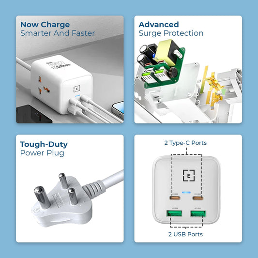 EMBOX 6-in-1Extension Board with USB Port | 65W Gan Charger Type C Fast Charging (QC 3.0) Extension Board with Switches | 2 Type C PD Ports 2 USB Ports 2 AC Power Strip