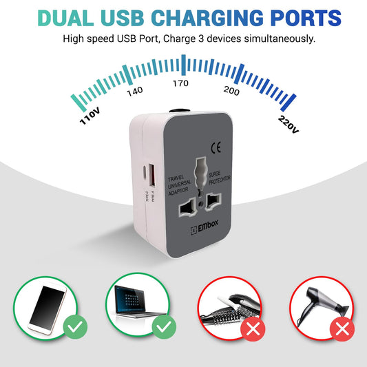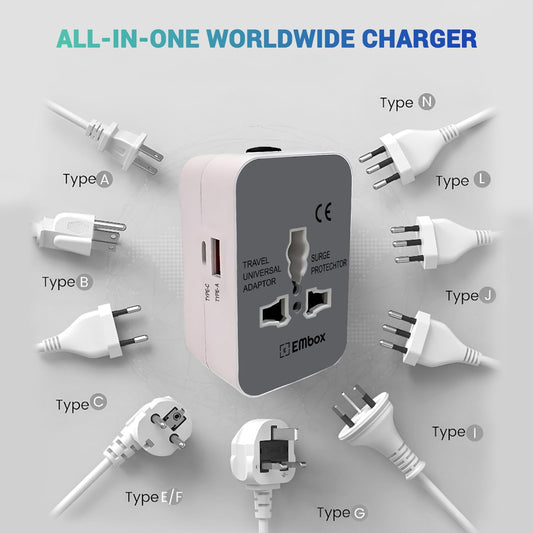 Embox Universal Travel Adapter | All-in-One Worldwide Charger Adapter with Type C, USB & Type A Ports | Supports 224+ Countries | International Plug for Phone, Laptop, Gadgets (100–250V, White)