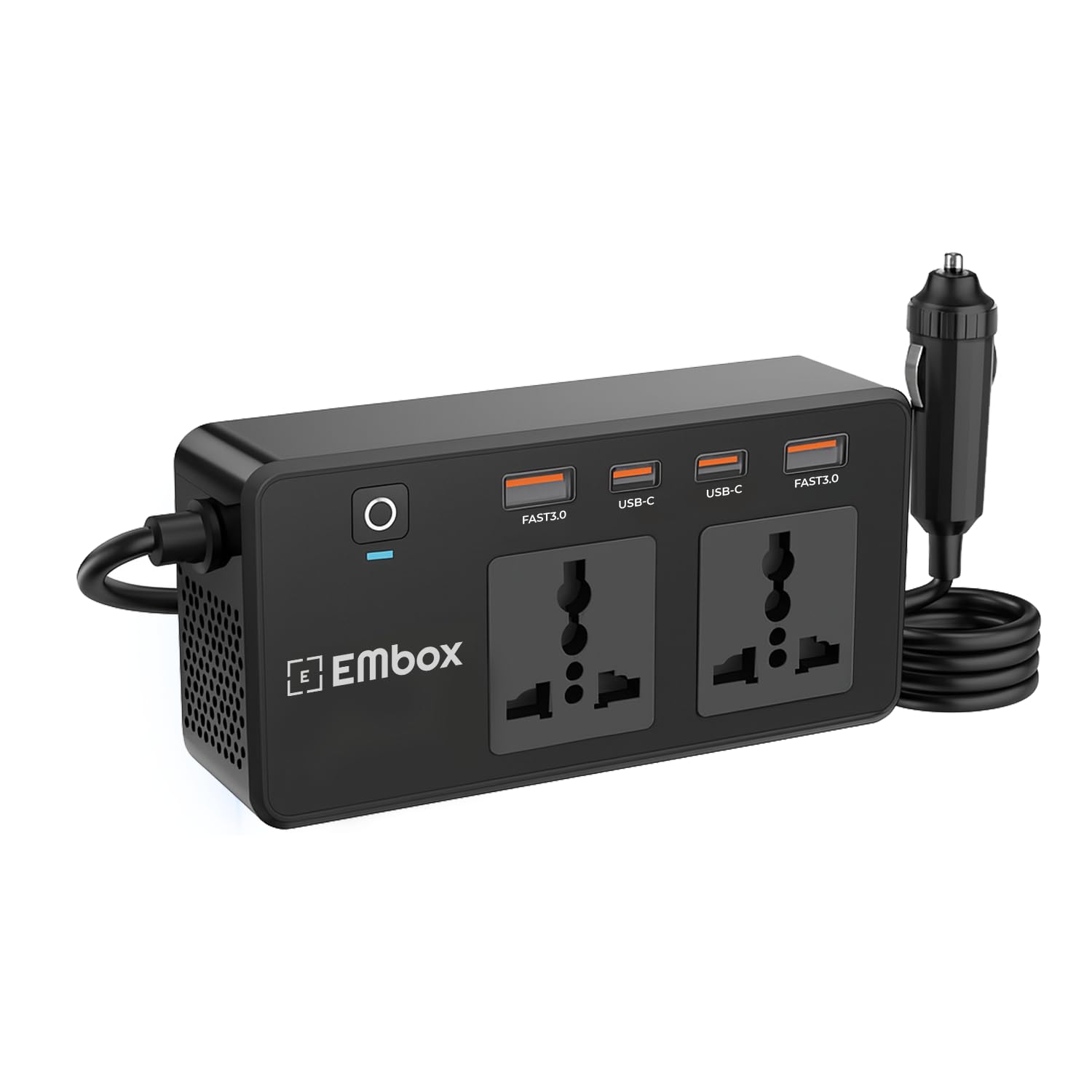 Embox 200W Car Power Inverter Laptop Charger with 2 USB (6.2A Max) & 2 C-Type (1 * 27WPD) Smart USB Ports, 2 AC Universal Outlets and 12V DC to 220V AC with QC3.0, Black