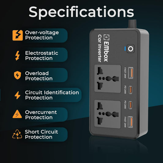 Decrease quantity for Embox 200W Car Power Inverter Laptop Charger with 2 USB (6.2A Max) & 2 C-Type (1 * 27WPD) Smart USB Ports, 2 AC Universal Outlets and 12V DC to 220V AC with QC3.0, Black