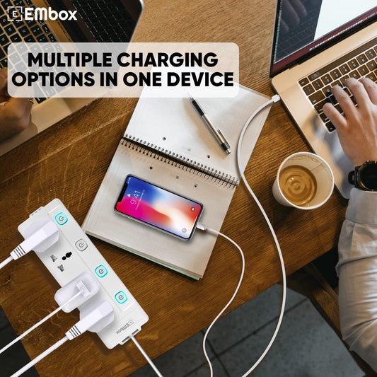 EMBOX Multi Plug Socket 2500W | Extension Board with Switches | QC 3.0 Type C USB Fast Charging | 2 Universal Socket Extension Cord, White