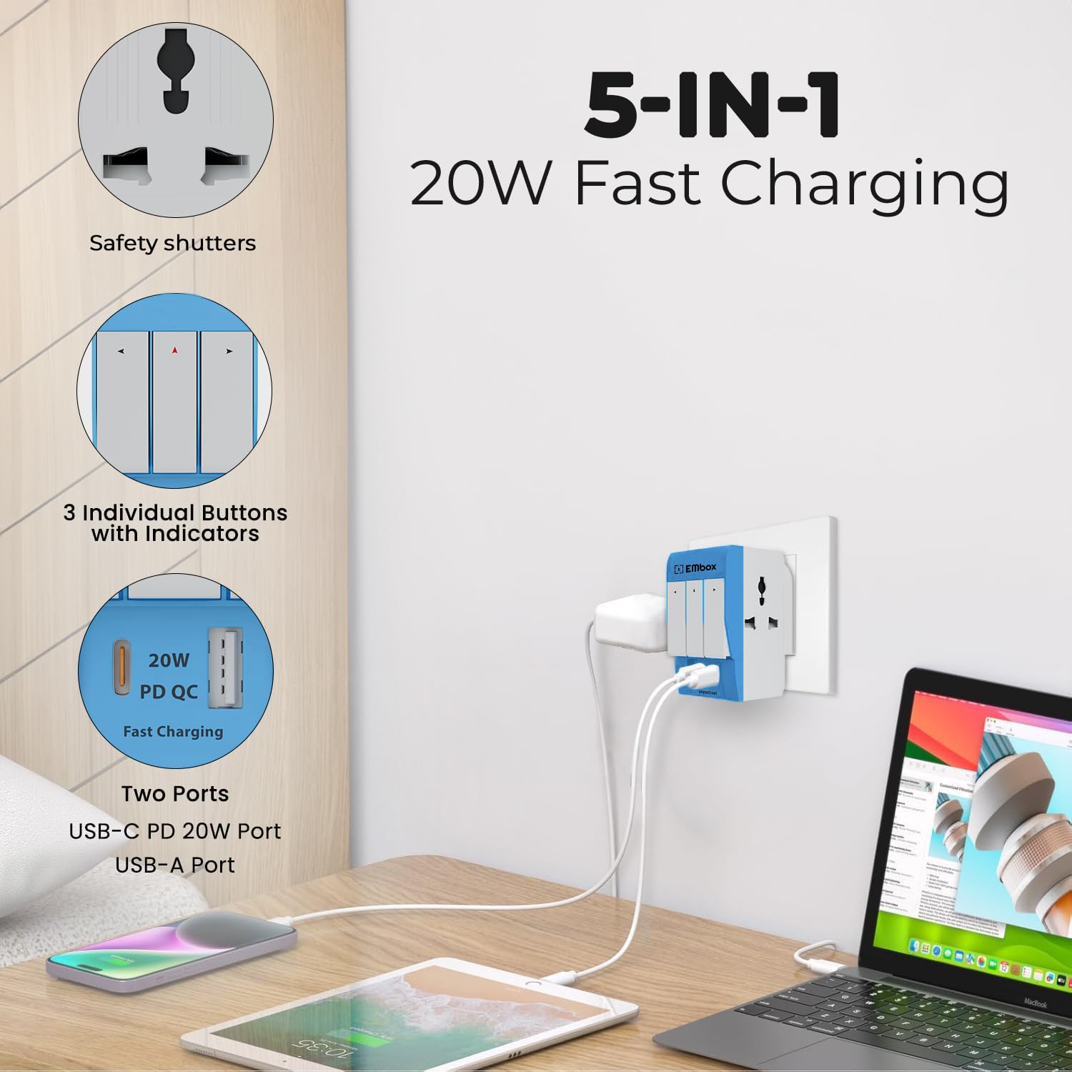 - Reliable & Ergonomic Embox Multiplug sockets: Our EMbox 3 - Pin Plug Travel Adapter is designed for effortless usage of any of your electronic devices or computer accessories at office or home as switch boards for home wall. Mindfully designed three pin plug socket with an *LED INDICATOR - Ensures the device is ‘ON’, *SAFETY SHUTTER - No direct touch to electricity supply, SURGE PROTECTORS - Pulls excess energy away from your electronic device, keeps your electronic device safe.